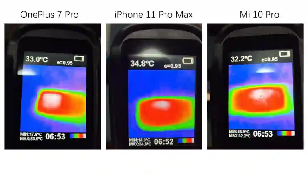 我们通过进行一小时的「和平精英」游戏之后实测,用热像仪测出 一加 7 Pro 的峰值温度是33度,iPhone 11 Pro Max 是34.8度,小米10 Pro 是32.2度。