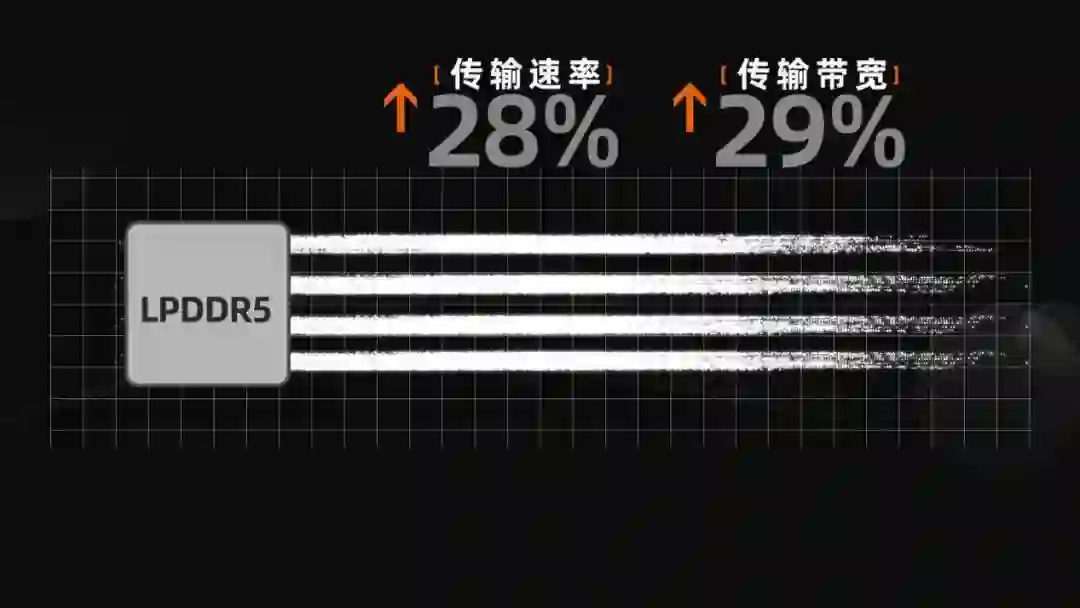 熟悉电脑的同学就应该知道,DDR,全名叫双倍速率同步动态随机存储器,是内存的其中一种。而 LPDDR (Low Power DDR) 是专门为移动端所设计的内存,又称 mDDR(即Mobile DDR)。而内存的主要作用就在于加载手机操作系统和应用程序。内存传输数据的效率越高,手机的运转和响应速度就越快。同样是 8G 内存, LPDDR5 相比起上一代的 LPDDR4X,在性能和功耗两个方面都做到了明显的提升。