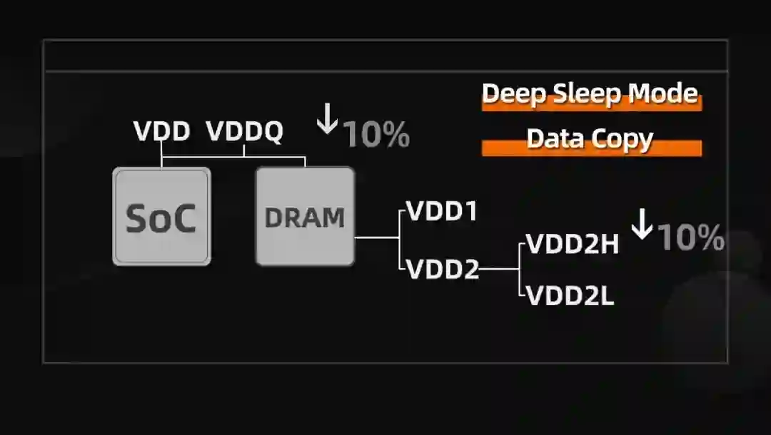 而在功耗方面,在 Soc 和 DRAM 上,我们把供电电压叫做 VDD,VDD 又分为 VDD1、VDD2 和VDDQ。VDDQ 是 Soc 和 DRAM 之间的供电电压,那么 VDD2 又分为 VDD2H 以及 VDD2L。LPDDR5 通过优化把负责 DRAM 供电的 VDDQ 和 VDD2H 电压降低了 10%。并且, LPDDR5 还支持了 DSM 深度睡眠模式、Data Copy 重复数据模式,能让内存以低功耗模式进行数据的读写,提高性能的同时还有效地降低了功率。