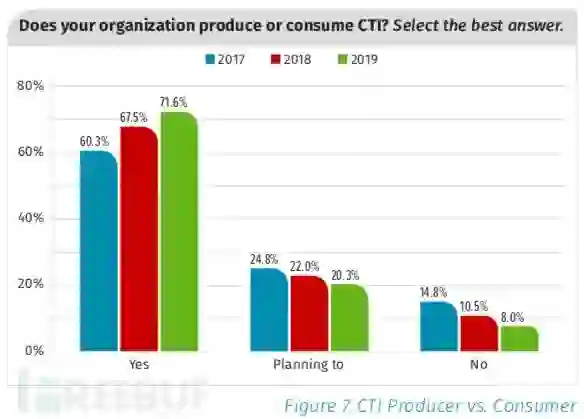SANS则观察到,威胁情报的应用案例正在多样化,抽样调查中的大小型组织都在广泛使用威胁情报,自2017年至2019年,生产或消费情报的组织占比逐年增加,目前完全没有意愿去生产或消费情报的组织只有8%,换言之,92%参与调查的组织已经正在或即将使用、生产威胁情报领域。