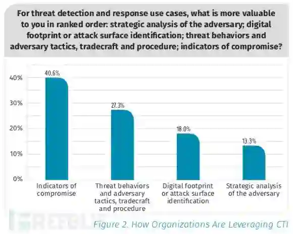 SANS的调查数据显示,**失陷指标(IOC,一种可机读威胁情报)**的排名最高,有40.6%的人选择;其次是威胁行为和对手TTP,占到27.3%;第三位是Digital footprint与攻击面识别,占到18.0%;最后是对手的战略分析,13.3%。