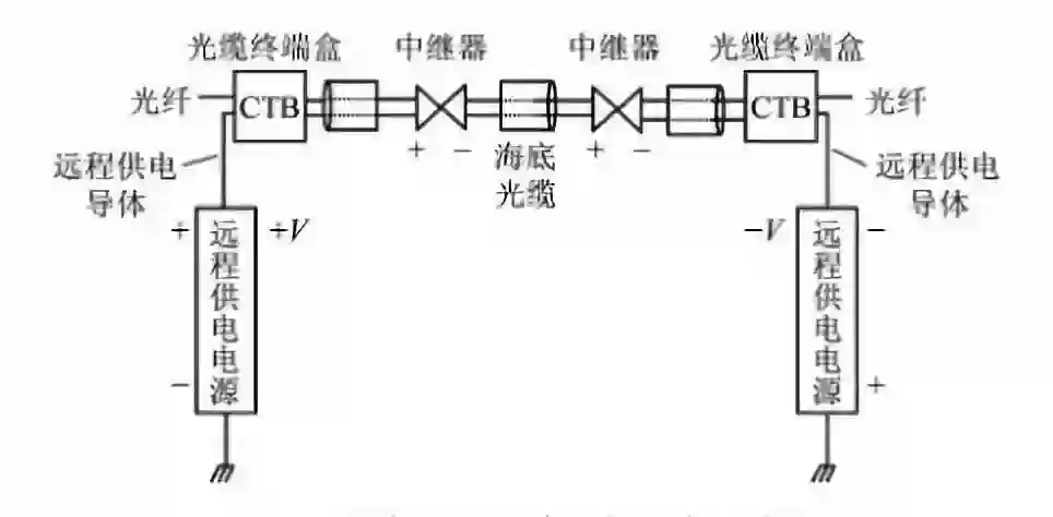 如上图所示,海底光缆系统在两端的陆地上配置了远供电源设备。它通过海底光缆上的远供导体,向海底中继器馈电,从而解决供电的问题。