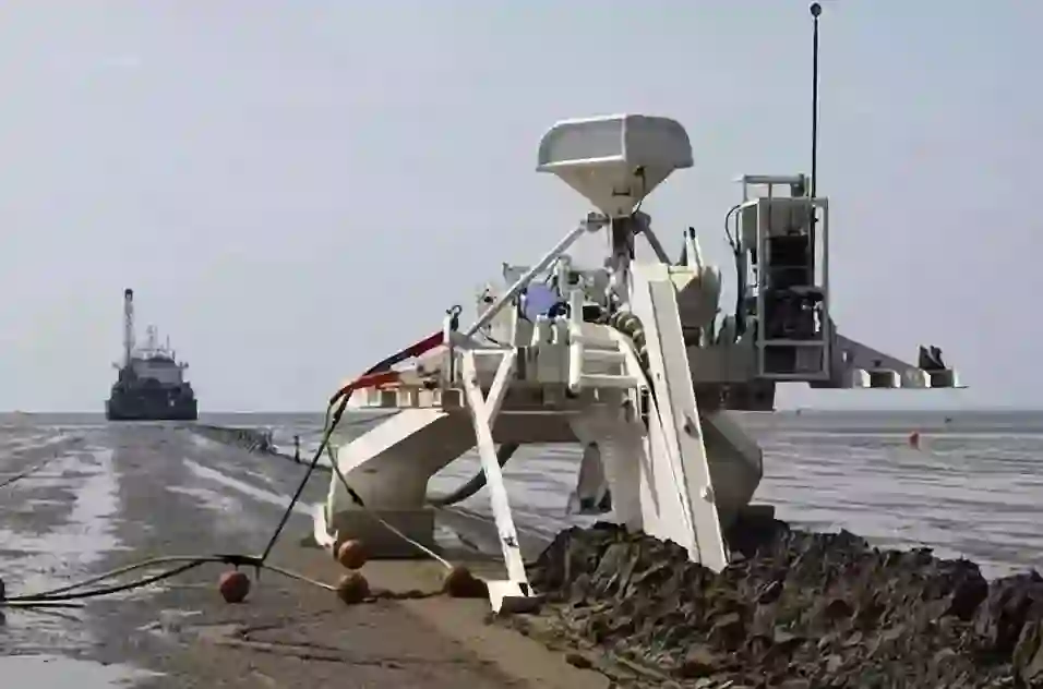 其中在浅海区域,光缆敷设船停留在距离海岸数公里的位置,通过岸上牵引机的牵引,将放置在浮包上的光缆向岸边牵引,然后拆除浮包,使光缆沉至海底。