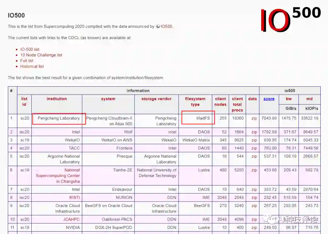 这一文件系统也被用在了鹏城实验室的超算系统上,参加了全球公开的IO500测试,获得了今年IO500 榜单的第一名。