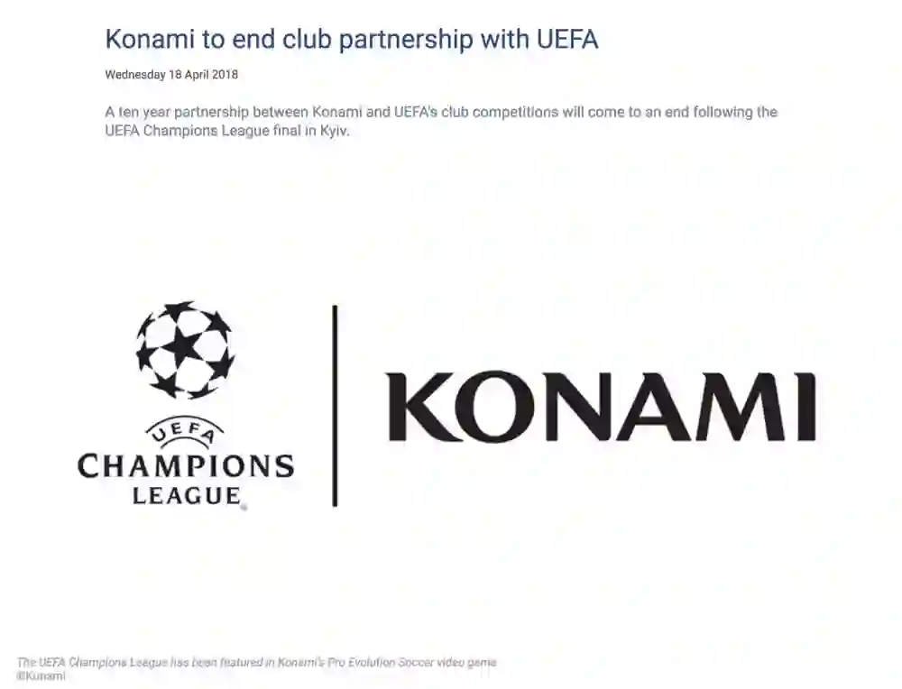 不仅如此,随着宣布Konami和欧冠十年的授权合作在2018年到期,从2019年开始欧冠改为与《FIFA》签约。实况失去了自己最后一个签约的联赛,这个发展了20年的游戏系列面临着无比尴尬的现状。