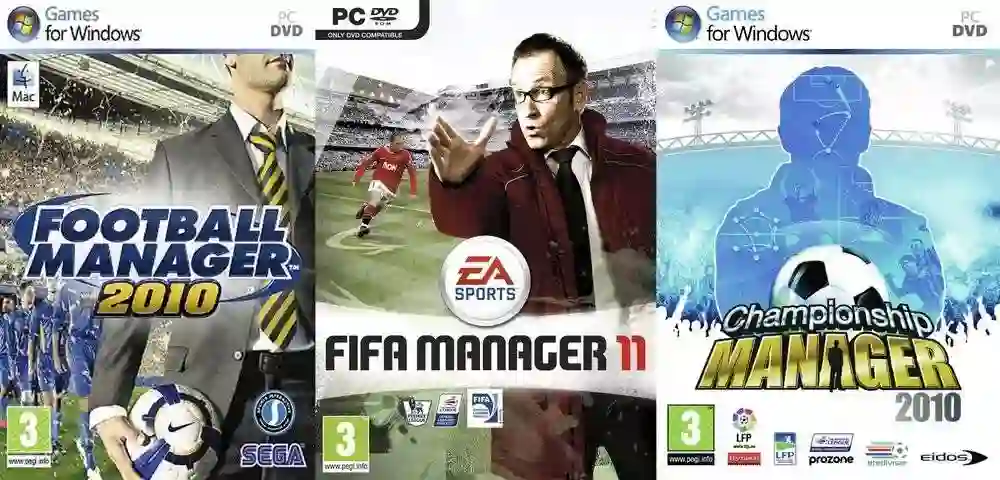 从左到右为《足球经理》《FIFA足球经理》《冠军足球经理》