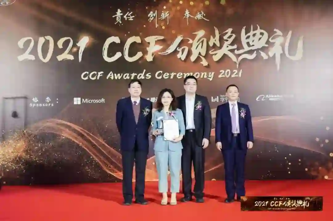 △2021年CCF杰出贡献奖获奖者王巨宏女士与颁奖嘉宾合影