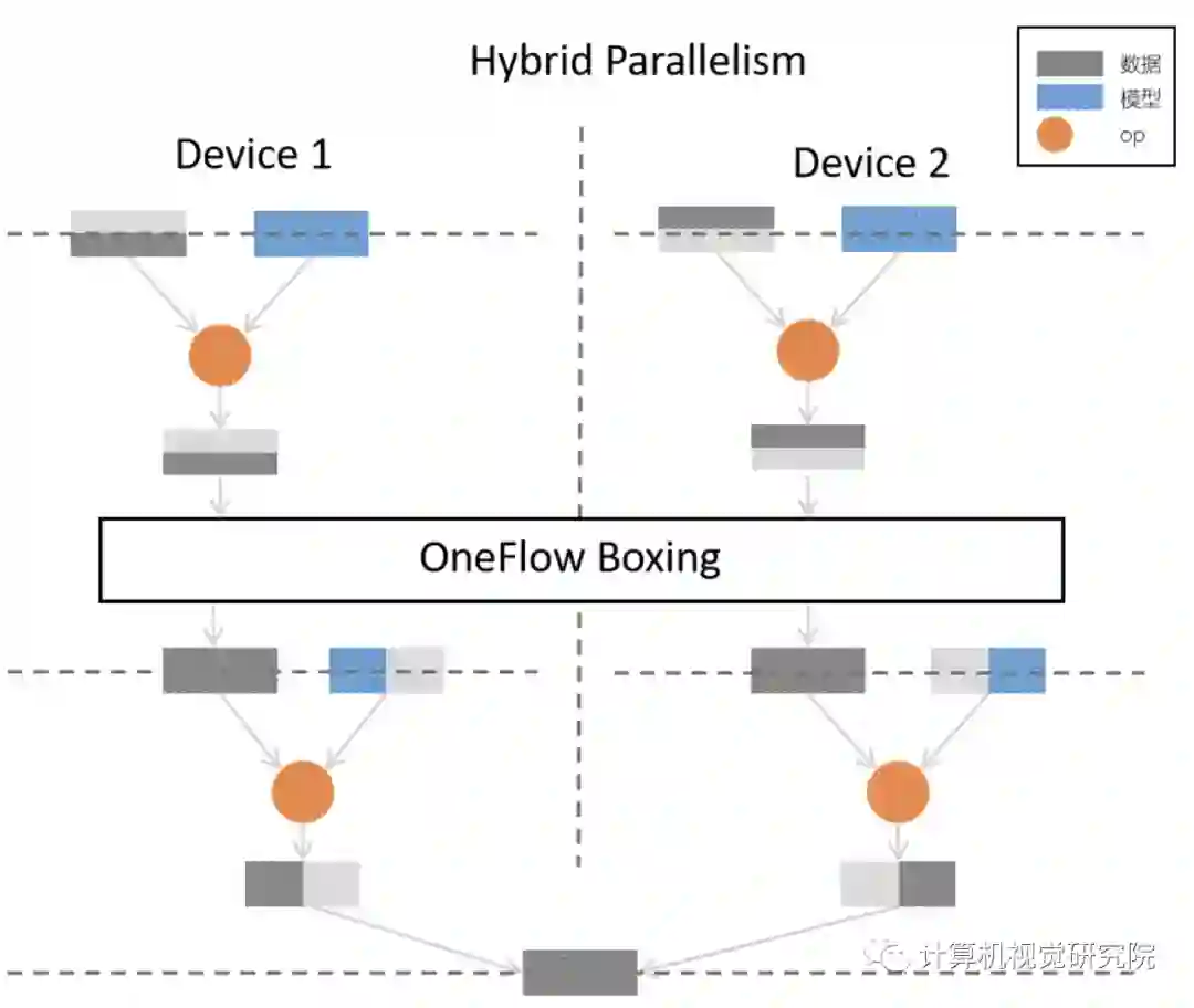 在 OneFlow 的计算图搭建过程中,每个计算 Op 都有一个属性叫做 Placement,表示了该逻辑上的 Op,是要部署到哪些机器哪些设备上的。对于常见的数据并行,就是所有的 Op 都部署到所有的设备上。但 OneFlow 也支持用户指定 Op 的 Placement,比如当网络过大单卡根本放不下的时候,在 OneFlow 可以让网络的前一部分在一张卡上,后一部分在另一张卡上,用一种“接力”的方式工作,实现流水并行。