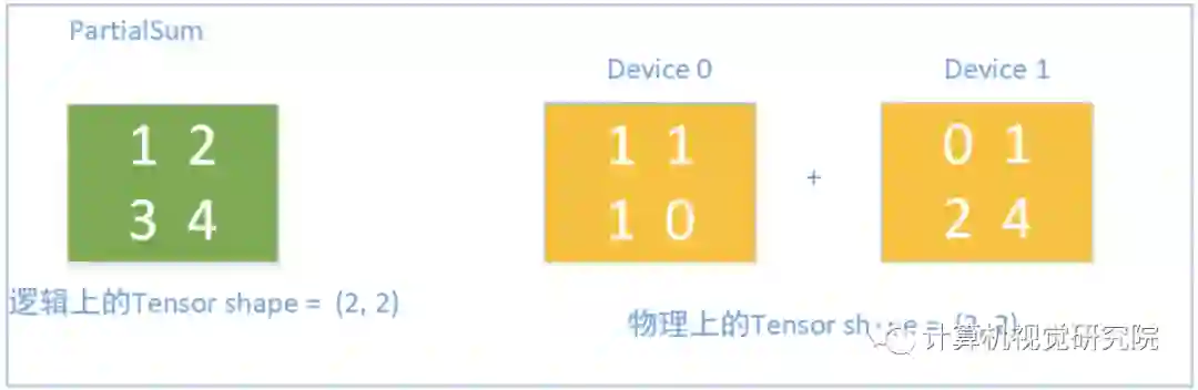 PartialSum 表示物理上的 Tensor 虽然跟逻辑上的 Tensor 形状一致,但是物理上的 Tensor 里的值是逻辑 Tensor 里对应位置的一部分,如果把物理上的多个 Tensor 按照对应位置相加,即可还原出逻辑上的 Tensor。