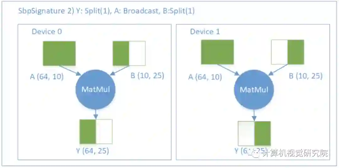 两种合法的 signature 在两个设备上的示意图如下图所示。假设逻辑上的 MatMul 的输入输出 Tensor 的形状是: