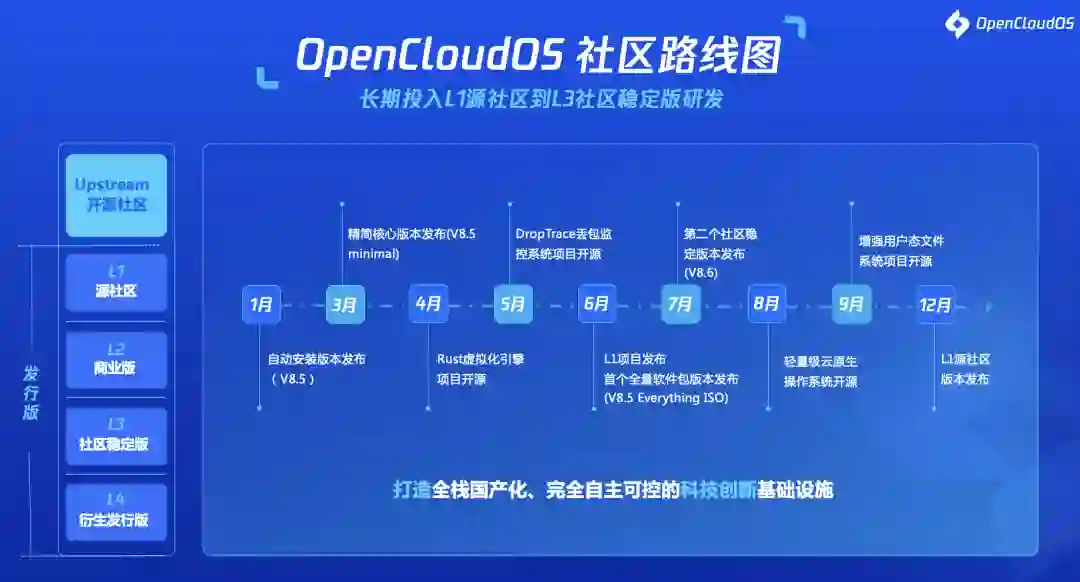 OpenCloudOS 源社区是 L1 级别的 Linux 发行版,不依赖任何商业和社区发行版本。其内核及用户态软件均来自【UpStream 社区】最新稳定版本,具有创新先进、经济绿色、安全可信、兼容易用等特点。