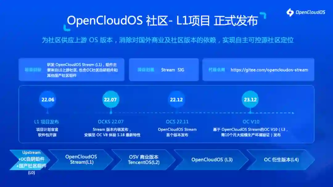 6 月 22 日,在 2022 OpenCloudOS 社区开放日上,国产开源操作系统 OpenCloudOS 正式发布首个源社区(L1)项目及首个全量软件包(L3)版本,并披露其技术研发路线图。