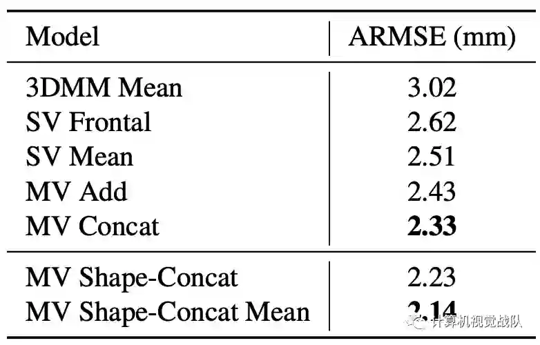 然后,将形状参数的N个输出输入到第二个块中,第二个块将其组合成一个全局3D形状,我们称之为合并块M。合并块是通用的,可以通过任何聚合信息的操作来实现。最后,使用MLP回归3DMM的形状参数,该参数将通过下面方程的映射线性地转换为三维形状。