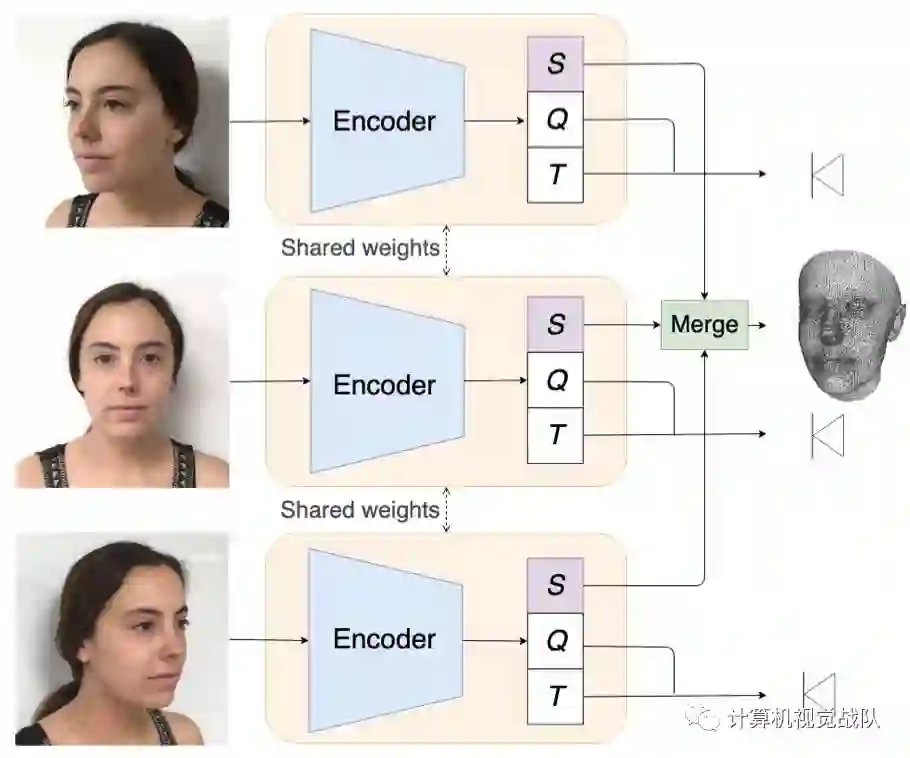我们的多视图体系结构由两个主要模块组成。第一种是前面描述的单视图结构,它作为一个Siamese神经网络来预测单个摄像机,为每个视图设置c和形状参数αˆ。