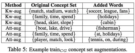 他们的第一个方法:Kw-aug和Att-aug,分别在训练现成的关键字提取模型注意值时,从参考文献中提取关键字,使用它们在训练时扩展输入概念集。(通过动作联想场景,通过名词联想动作,也就是由名词扩增动词,由动词扩增状语等)