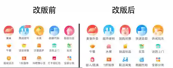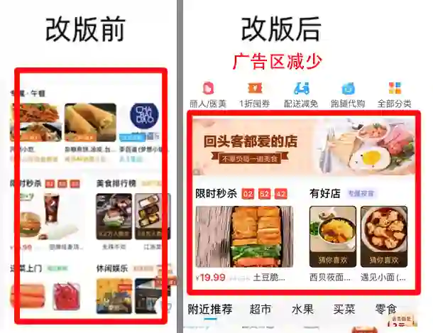 例如:原来的限时秒杀、美食排行榜、送菜上门、休闲娱乐4个推荐区,减少成了2个——保留的“限时秒杀”与“有好店”。