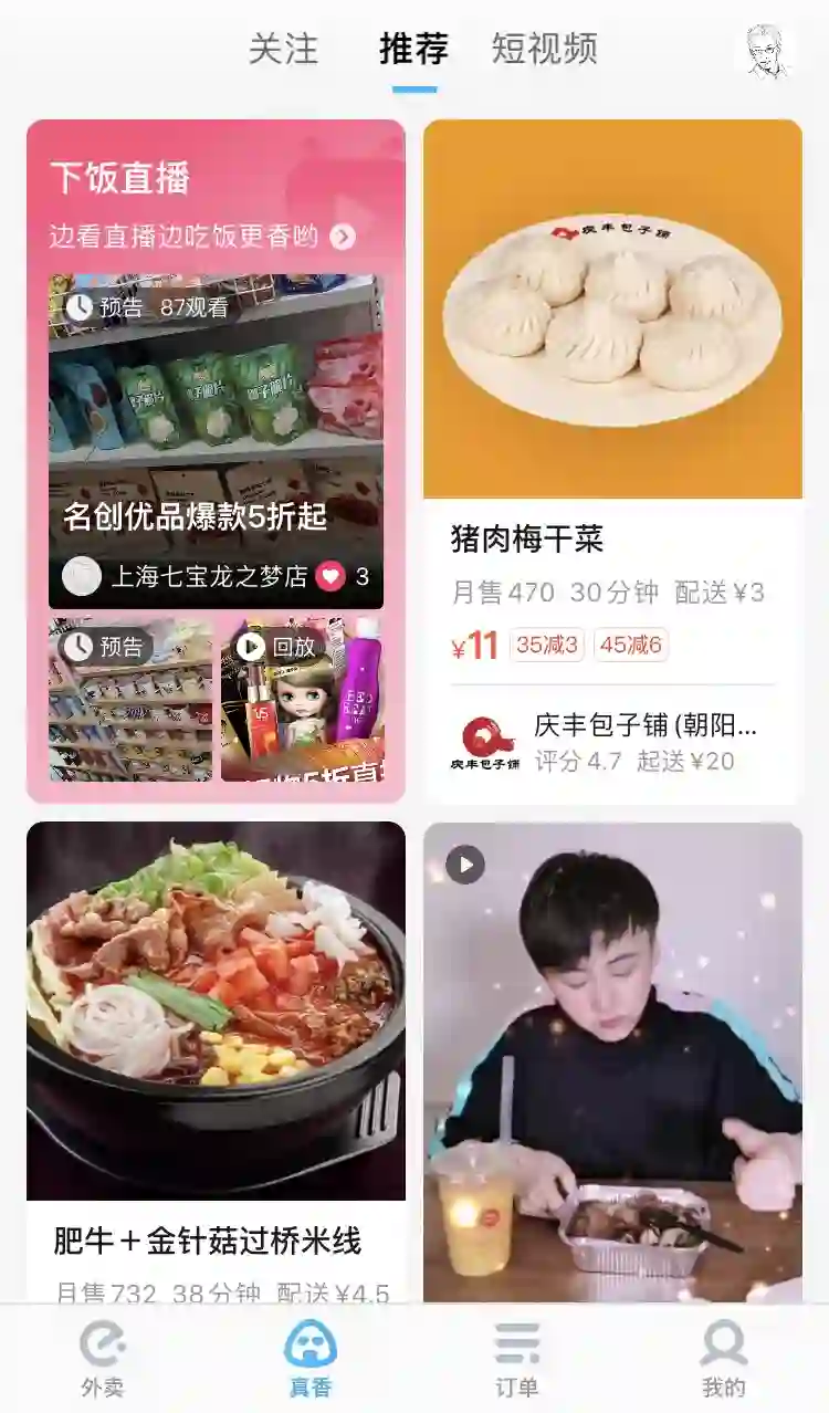饿了么“真香”这个栏目,主要由商家、品牌(蓝V)、美食达人(黄V)组成。商家可以上传15秒左右的美食短视频,美食达人会有吃播轮播、菜肴制作等相关的短视频。
