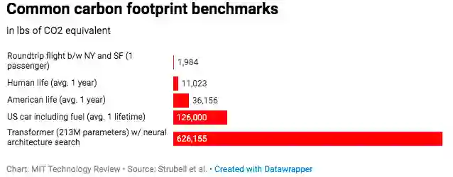 2020年6月,马萨诸塞大学的研究人员发布了一份报告,估算出训练和搜索某个模型所需的能量大约需要626,000磅的二氧化碳排放量,相当于美国汽车平均寿命排放量的近5倍。