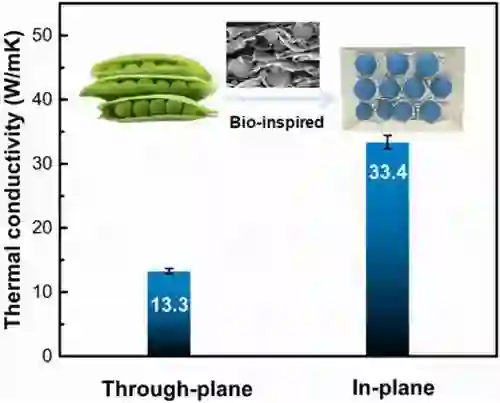 除此之外,研究还发现在石墨烯抽滤过程中引入微米尺度的球形氧化铝颗粒,可以使得石墨烯片取向由水平方向部分转变为纵向方向,得到具有类似“豌豆荚”的结构。这类仿“豌豆荚”结构的二元石墨烯-氧化铝填料可有效增强聚合物材料的导热性能,该方法制备的环氧复合材料纵向和横向的导热系数分别可达到13.3W/mK和33.4W/mK(如图2所示)。