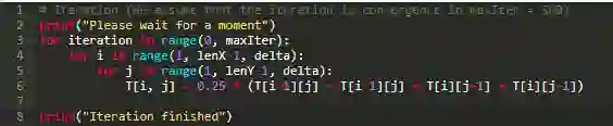 让我们回到拉普拉斯方程上,下一节我们将使用 Python 来计算简单的二维热传导方程。首先我们默认读者们已经了解了关于有限差分法的基本理论知识,此处我不再详细介绍有限差分法的内容,离散化带来的误差问题,稳定性问题,一致性问题,收敛问题以及测试优化问题等我也不详细说明。同样,我们也将会跳过很多计算公式。