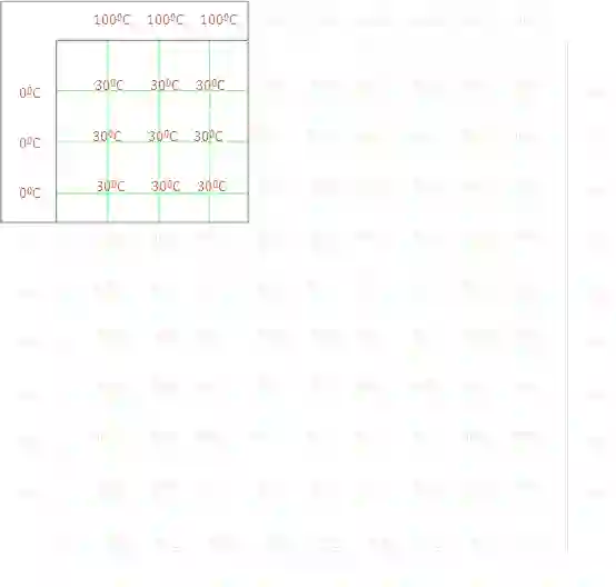 下面让我求解这个方程。为了求解这个方程,首先使用为所有的绿色节点假设一个猜测值,此处的猜测值是 30 摄氏度,当然你也可以设置为 35 摄氏度,因为我们并不知道其具体是多少度,这只是一个假设值。我们将迭代这个方程,直到迭代前后值的误差非常小为止,我们称之为收敛。在迭代的过程中,节点的温度值会自动的调整,所以当我们的猜测值越接近真实值,求解的速度就越快。