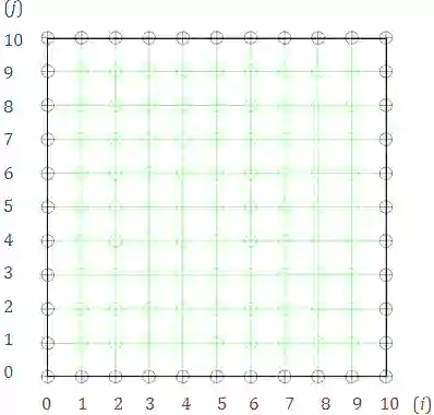 我们求解的问题是:在给定边界温度的情况下,求出二维平面内每点的稳定温度(即为拉普拉斯方程的解)。下面,我们将离散化整个二维平面,使用方格将其分割,然后使用有限差分法将拉普拉斯方程进行离散化。下图展示了离散化后的平面区域。