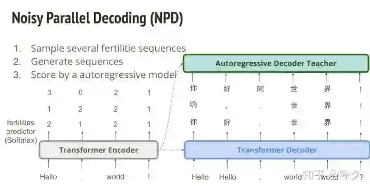 还有一招叫作 Noisy Parallel Decoding (NPD)。它的概念是,我们先训练好非自回归模型后,解码时,其实是可以采样不同的 fertilities。这样就能确保随机性,输出一大堆不同的句子。这些句子再交给自回归模型来评分,选择一个最好的句子当成答案。