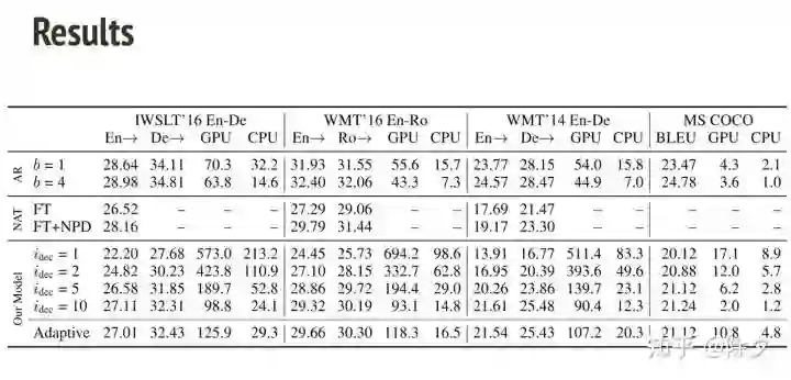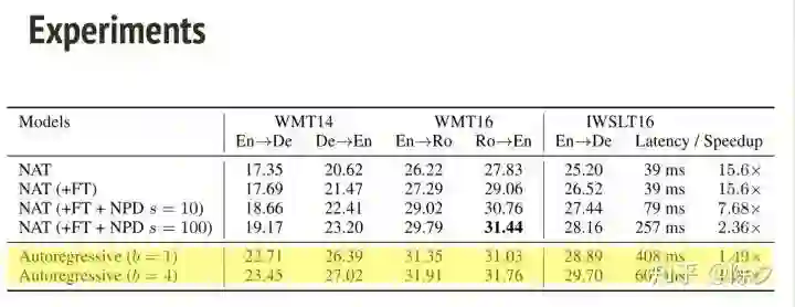 所以我们就有三种方法可以加强非自回归模型。从结果来看,b 代表的是 beam search size。在解码推断上,NAT 速度会显著快于自回归模型,但表现低于它。我们一步步把三个 trick 加上去,会发现表现越来越好,直到与自回归模型相当。即便如此,速度也是自回归模型的至少两倍。