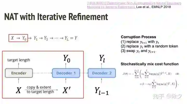 这就是第一种迭代优化的变体。它一开始也是一个编码器,去预测目标token的长度。然后把每个 token 按照长度去复制,输入给解码器1生成出 Y0 做第一次迭代。接下来我们把 Y0 再输入给解码器1输出Y1,做第二次迭代。以此类推。我们要怎样训练这第二个解码器呢?我们除了可以直接拿Y1和正确答案算损失外,我们也可以随机加一些噪音丢给解码器2,让它去学去噪的过程。加噪音可以直接把某个 token 重复两次,或者直接把某个 token 换成随机的 token,再或者是把两个 token 交换。接着我们让模型去学习两种不同的损失,前面那项是第一个解码器的损失,负责计算把根据长度复制的X‘输入给解码器后得到Y0,与正确答案的交叉熵,后面那项是迭代优化去噪的交叉熵。