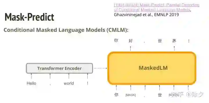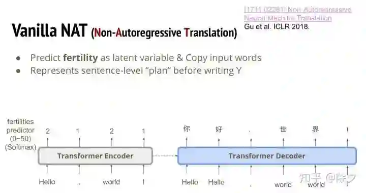 ICLR 18 出了第一篇用非自回归模型做翻译的模型。非自回归翻译简称叫 NAT。这篇文章的概念还挺简单的。它提出了几种改良方法。第一种方法是,我们在 transformer 的编码器这里,每个位置去预测一个数字。这个数字代表的意义是,这个输入的字,对应输出的几个字。我们预测完这个数字后。就把输入给解码器的token 嵌入来拷贝该位置输出的数字份。图中 Hello 的位置编码器输出2,解码器的输入就有两个 Hello。为什么我们要预测这个数值呢?其实它代表了解码器对这个输出的规划。
