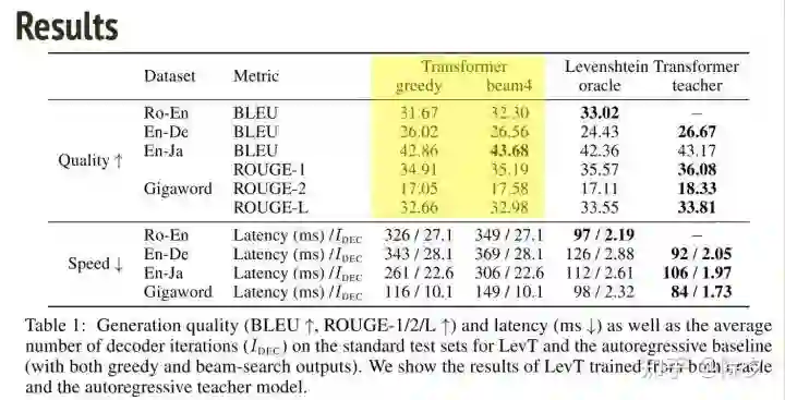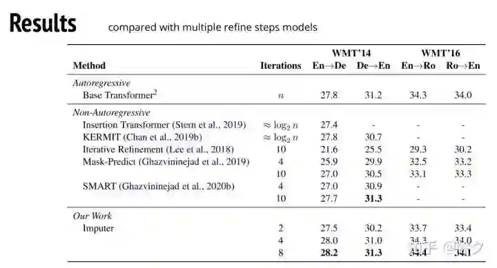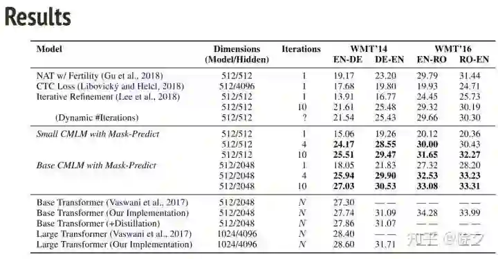 从结果上看,这种 MASK-predict 的方法显著好于过去非自回归的生成,甚至好到要接近自回归模型的生成。