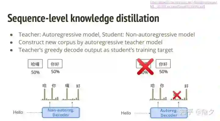 类似的,我们可以让自回归模型作为老师,非自回归模型作为学生。但后面的事情有一小点不一样,我们不用自回归模型的预测分布作为监督信息。而是让自回归模型的贪心解码输出作为新的训练语料。用它来作为学生的训练目标。为什么这种方式可以解决 multi-modality 问题呢?因为输出之间没有考虑依赖,所以错误的翻译概率会很大。但如果我们的数据集有先给自回归模型做解码,它在生成出第二个字的时候,其概率分布依赖于之前生成的字。比如第一个字预测的是 "你",那第二个字预测出是 "喽" 的概率就会变小。这样一来,正确答案里面就不会有"哈喽"这个可能,只会留下 "你好" 这个可能。这样做完后,数据集就会变干净,更容易让自回归模型去学习。