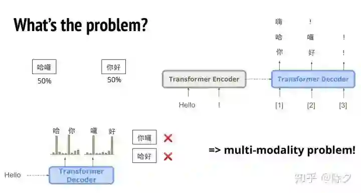 说完图像的例子,现在我们来回到文字的例子中。我们有一句英文,想要把它翻译成中文。可是中文可以有很多不同的翻译方法。比如,Hello 可以翻译成你好,或者是嗨。假如我们有一半的概率是你好,一半的概率是哈喽。那么 Transformer 解码时,第一个字 "哈" 和 "你" 的概率是差不多大的。第二个字是 "喽" 和 "好" 的概率是差不多大的。所以 Transformer 会生成出错误的翻译,比如 "你喽" 或者是 "哈好"。这便是 multi-modality 问题。同一个输出,可能对应到很多不同模式的输出。如果是非自回归,它会把各种可能的模式叠加在一起,作为输出。所以这个 multi-modality 是我们关键要解决的问题。