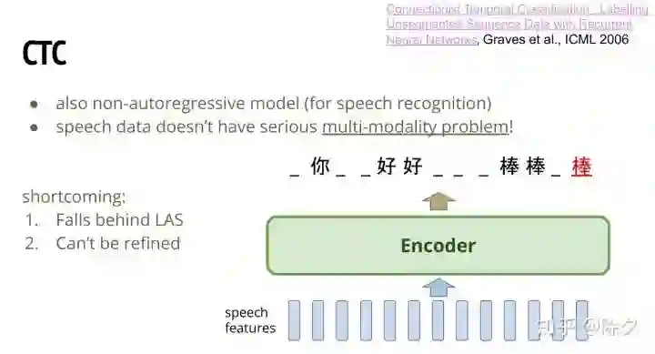 CTC 也是一个非自回归模型。对于语音数据,通常不存在很严重的 multi-modality 问题。这是因为语音中,前一个时段的发音对后一个时段的发音影响依赖很小。通常一段语音就是搭配一种可能的说法。之前语音识别的笔记中有讲到,编码器可以直接一口气生成一个序列。对于每个 frame 就输出一个 token。这个 token 可以包含空白的 blank token。所以最终模型输出了如图那句话后,可以把 blank tokens 拿掉,把重复的字缩成一个字。最后就会生成出 "你好棒" 这个序列。CTC 有几个小缺点。虽然它的表现一直还不错,但是它还是会输给 序列到序列的 LAS。另一方面,CTC 虽然是个非自回归序列生成模型。但它没办法做迭代优化的动作。因为输入是语音,而不是文字。文字不能再拿来重新当作输入喂给模型。假如我们输出了一个错字。这个错字是没有机会被修正的。