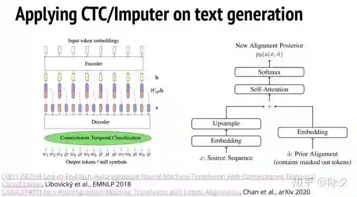 这种 CTC/Imputer 的方法有没有办法用在文字生成上呢?其实有两篇论文都是在做这件事情。我们想要做一个翻译的任务,可能是中译英。输入句子在经过编码后,会做一个上采样的操作,每个位置的嵌入会被分裂成两个小向量。这样我们的句子就变长了,有点像语音信号那样的序列。我们再对这个变长的序列,去训练一个 CTC。这样就可以用 CTC 来做翻译。Imputer 也是一样。它左边部分原本是要放语音信号的。但是我们现在换成源序列句子,对其嵌入上采样后,把变长的序列当作原版的 Imputer 中的语音信号来处理。