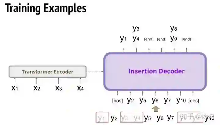 接着,我们用这样处理出的训练数据集取训练一个 insertion decoder。它是一个 transformer 架构。输入是前面方法处理后的个例,解码器目标是还原出 drop 掉的字。如果 drop 掉了连续两个字要怎么办呢?我们要两个y都去算损失。假如这两个字中间本来就没有字的话,就预测 end。