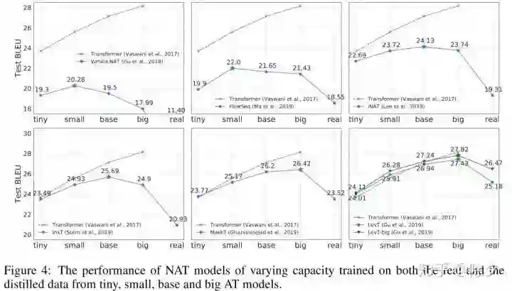 作者后面还做了一个分析。我们在不同参数大小的 teacher model 下去做蒸馏。不管和参数多大的自回归语言模型学,它都会比纯粹的 NAT 好。最开始的那篇 NAT 模型,和小模型学是最好的。但如果是迭代优化的 NAT 模型,则和中等大小的模型学比较好。如果是 Mask-Predict 或 Levenshtein ,和大模型学比较好。所以每种模型都有适合它的 teacher model 的参数大小。Levenshtein 的表现已经可以和自回归模型表现差不多了。