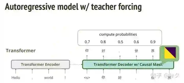这样可能有点奇怪,我们不就使用了自回归模型了吗,不就变慢了吗?但其实我们让自回归模型去为一个已经生成出的句子打分,是只需要一步就能完成。比如我们用 Transformer,把当前 token 的后面用 MASK 遮住,它就不能看到后面的字。这样一个 MASK 矩阵与 Transformer 解码器乘起来,就是整个句子的概率。