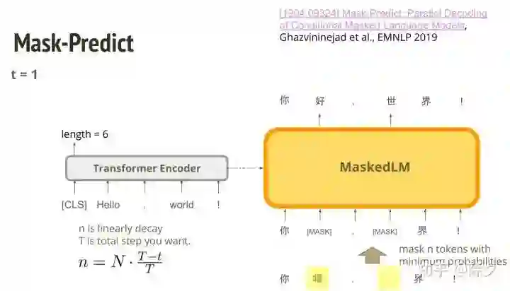 我们可以看一下个例。在t=0代表第一次的时候,模型一口气吐出了所有文字,发现有明显的语法错误。涂黄色的区域表示要 MASK 掉的 tokens。t=1,迭代一次后,错误明显减少。再迭代一次后,则翻译的很通顺,没有明显错误。