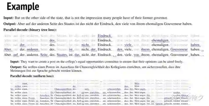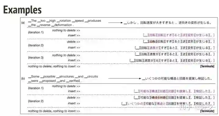我们再来详细地看一个例子。它的句子序列是日文。第一次迭代时,模型能一口气生成出很多文字,但由于上一期讲到的 multi-modality 问题,某些位置上的 token 会生成的不好,比如存在重复冗余的tokens。于是在第二次迭代的时候,它会把其中一些 tokens 删掉,再插入一些让句子更顺畅的 tokens。于是在短短三步之内,它就能生成出一句完整的话。