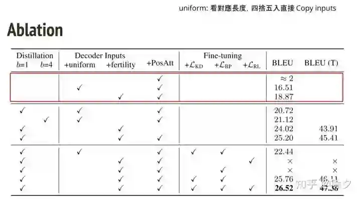 在消融实验中,可以看出,加上 fertility 之后,BLEU 分数可以进步到 18.87,加上蒸馏之后,分数一下子进步到25.20,。再加上微调之后,BLUE 略微提升了1个点左右。