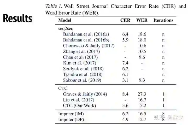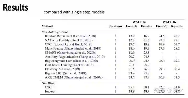 这个方法做纯文字的翻译,效果很好。我们可以看到它和其它所有非自回归生成的方法比较,CTC就可以胜过之前所有的模型。而 Imputer 又可以赢过 CTC,做到略胜一筹的表现。