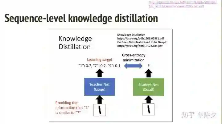 之前的 Fertility 是一种技巧。我们也可以基于知识蒸馏来做。假如我们要训练一个小模型,想让它和大模型一样好。那我们可以把小模型当作学生,向大模型学习。小模型在训练时,先把输入丢给大模型,让它预测出概率分布,作为小模型的监督信息计算损失。这样小模型就会学的比较好。