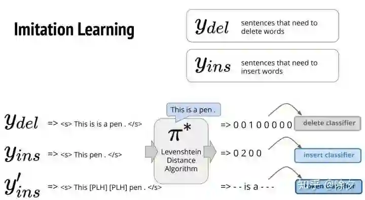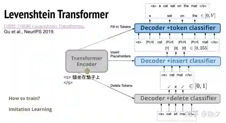 Levenshtein Transformer 相比于之前插入迭代的方法,它还增加了删除操作。解码器会生成三个部分。首先我们会有一个翻译到一半的未完整片段。我们把它丢进解码器后,再接一个分类器用来决定哪些生成的 token 不合适需要删掉。我们再把这个句子丢到解码器中,又接一个分类器用来决定哪些 token 之间需要插入新的token。最后我们把这个句子丢到解码器,再用一个分类器去决定要插入token的位置,应该插入什么新 token。我们要怎么去训练一个这样的模型呢?它用的是模仿学习的方法。