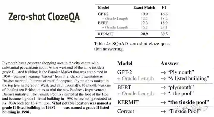 在 ClozeQA上做零样本学习,BERT 不能很好地判断空格要填入几个 tokens。但是 KERMIT 可以很自然地插入正确地字。同理在 SQuAD 上做零样本学习,KERMIT 也显著好过 BERT 和 GPT-2。