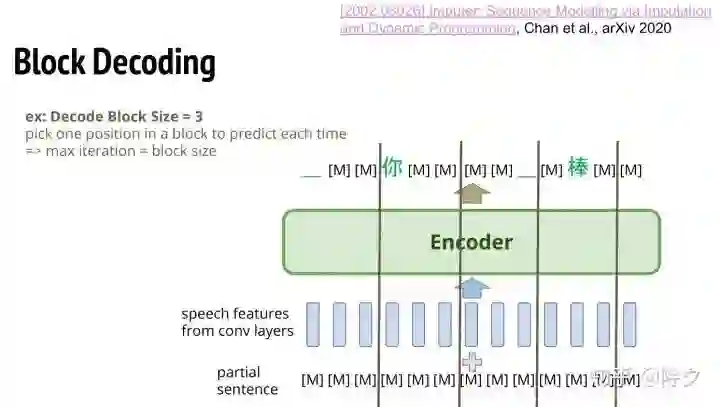 这边还会用一个叫 Block Decoding 的技巧。我们会让输入的特征有一个 Block。假如 Block 的大小是 3。那至少在一个 Block 里面,我们限制,至少一个 MASK 要被换成是真的字。这样做之后,模型在3步之内一定可以把全是 MASK 的序列变成最终生成的序列。