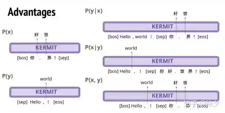 这样做是有个好处的。英文翻译中文的话,我们就可以把英文接中文。然后在中文的那边做插入的操作。它可以做到中英互译。我们还可以训练中文和英文的联合概率 P(x,y)。我们把中文和英文接在一起,中文 drop 掉部分字,英文也 drop 掉部分字。英文要预测插入的字的时候,它就可以看一下中文有什么信息。同理,中文要预测插入字的时候,也可以参照英文的信息来生成结果。当然,我们也可以只放中文或只放英文,去做插入的训练。这样一个模型就能学到 5 件事情。
