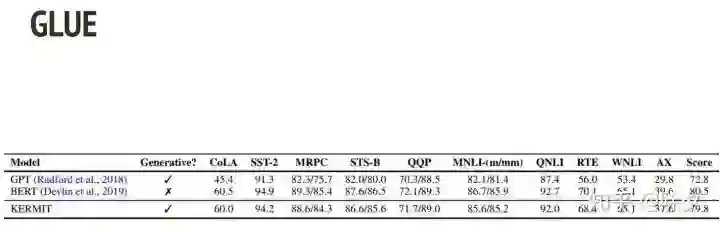 KERMIT 之所以用芝麻街中的人物命名是因为,它可以像GPT 和 BERT 一样作为预训练语言模型。KERMIT 的方法在 GLUE 上跑出来的效果,竟然和 BERT 不相上下。而比BERT厉害的是,KERMIT 又可以做生成,又可以和 BERT 一样做其它任务。