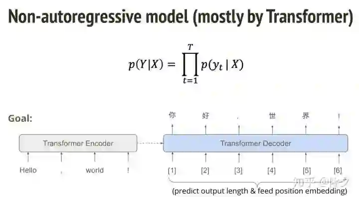一般自回归模型用的是 RNN,序列的 token 是一个个输入给模型。在解码时,每次生成出的 tokens 都会用来作为限制下一个 token 生成的条件。这样的方法有一个缺点在,当我们要解码生成的句子很长时,要花的时间就和解码的长度成正比。但我们有了 transformer 之后,我们编码时就不需要像 RNN 一样,需要吃前一个时间点的 token 后,才能编码下一个时间点的东西。所以它的速度是可以并行加速的。但在解码时,还是会遇到和 RNN 一样的问题。
