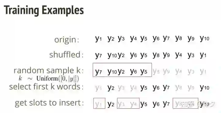 这样的模型我们要怎样训练呢?我们要怎样创造让模型去学的个例?假如我们数据集中有一段10个字的话,我们先把这10个字做顺序打乱,然后从0-10中随机挑k个数字,比如k为5,我们就只取前5个字。后五个字就是被 drop 掉的字。然后我们把这五个句子还原回来,被 drop 掉的字就会形成一个槽位,表示要插入字的位置。